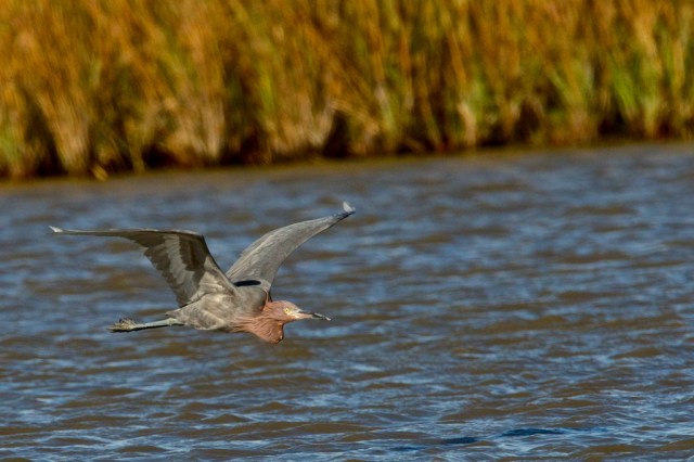 A reddish egret in flight over a small pond during our recent visit to the Galveston, TX area.