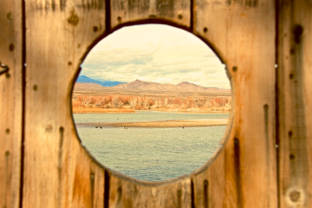 A porthole view of Bosque del Apache NWR and some of the surrounding mountains. This is from a bird blind which has been constructed at Bosque on one of their ponds.