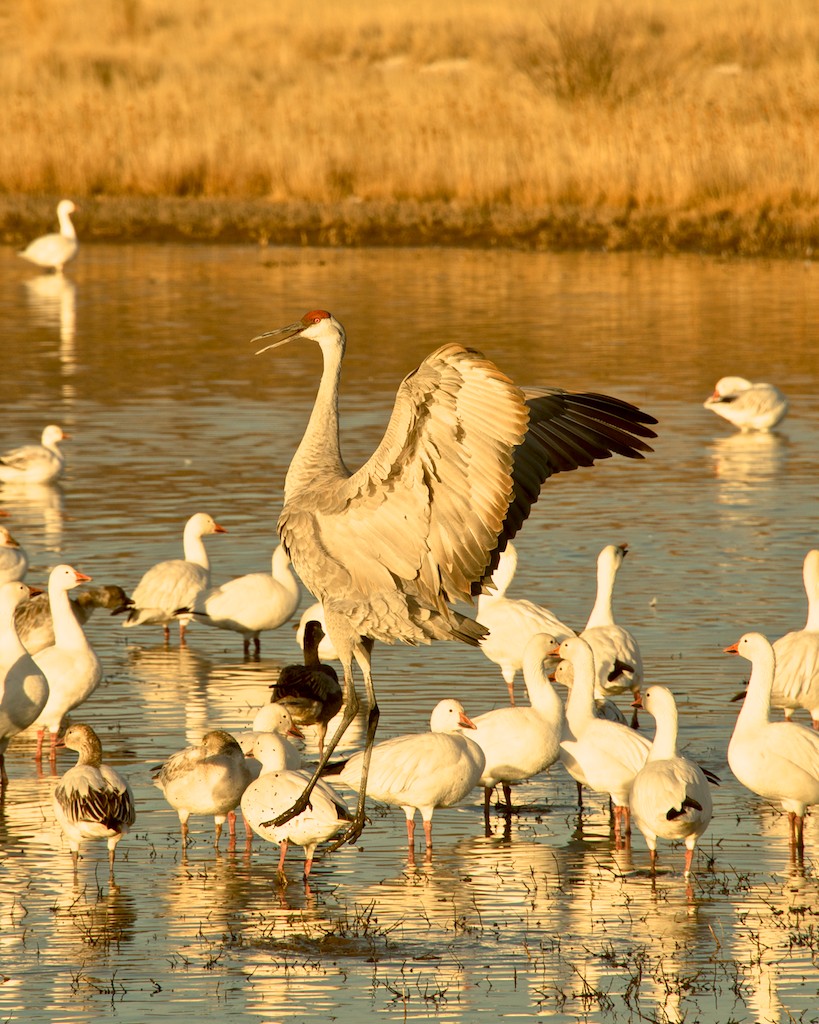 This sandhill crane was hopping around, either from joy or maybe thinking the snow geese were getting to close. LOL