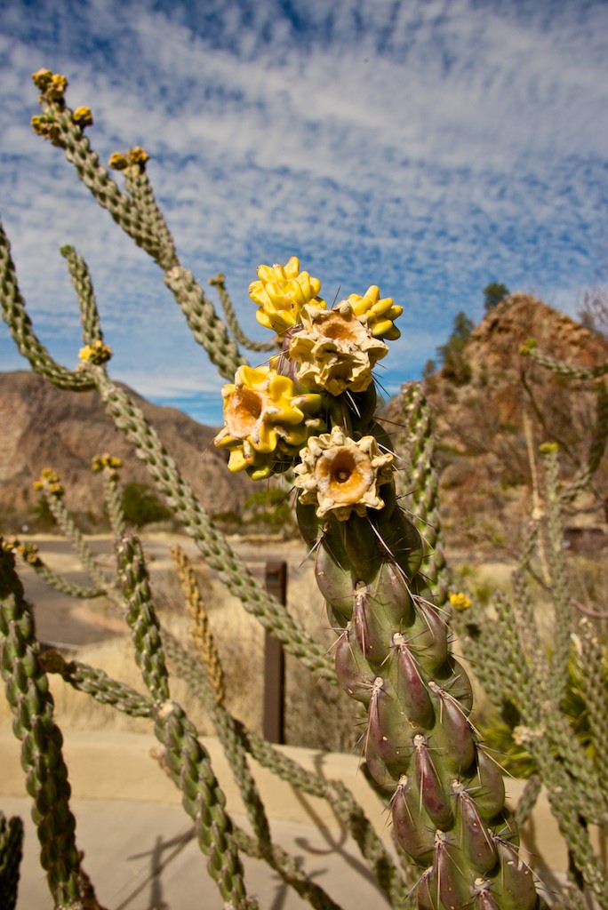 Another cactus blooming in the Big Bend National Park with some of the peaks of the Chisos mountains in the background.