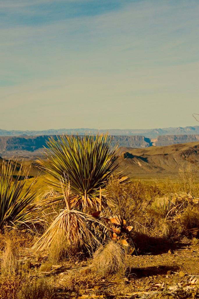 This is an even more distant view of the Santa Elena canyon in Big Bend National Park. It is the break in the distant cliff above the brown hills.