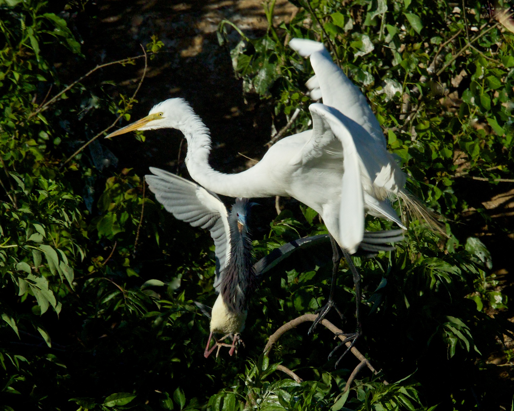 Tricolored heron wondering “how do I get around this great egret?” at the rookery in High Island, TX.