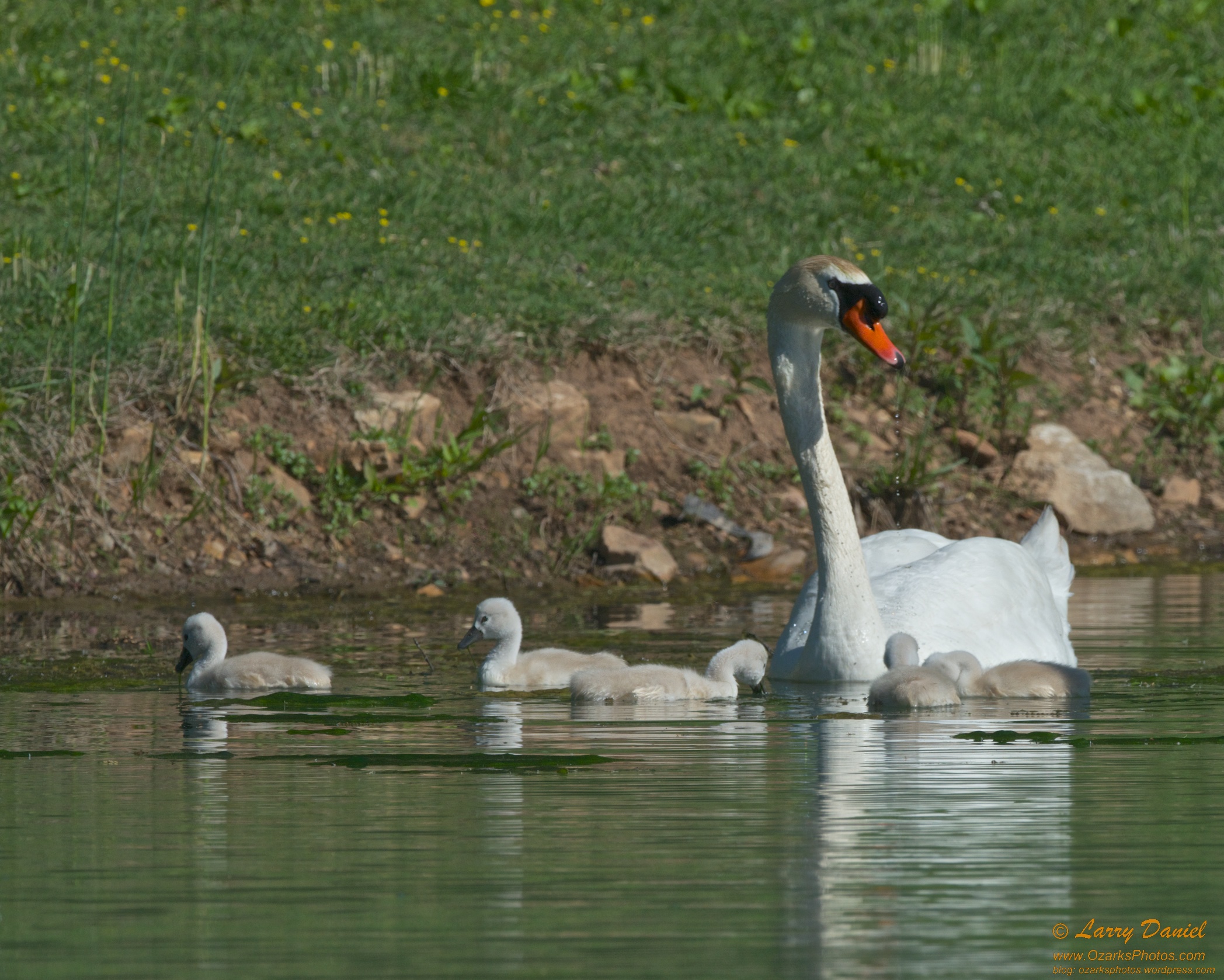 A mute swan, probably a male with its five cygnets. On a lake in Springfield, MO. The black part of the male’s bill/nose swells during mating season.