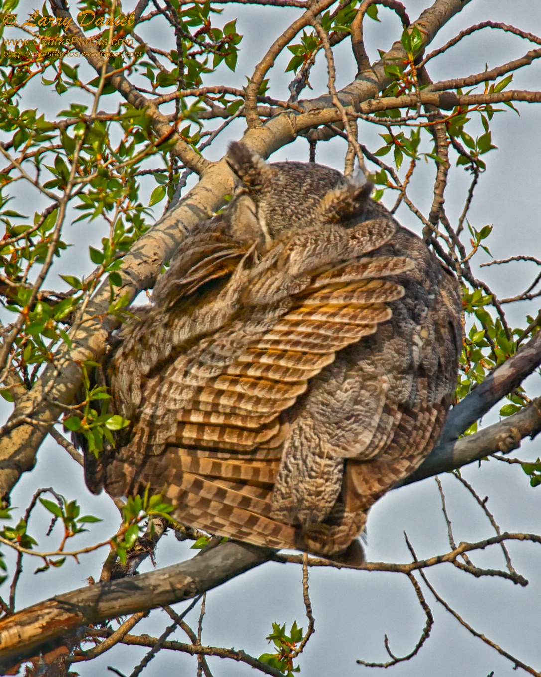 A great horned owl apparently taking a nap after a hard night of hunting prey and feeding owlets.