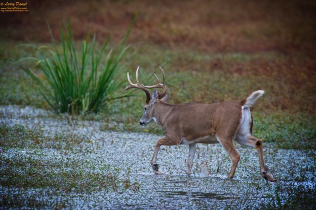 During our recent trip through Texas during hunting season we were lucky to see this nice white-tailed buck trotting through a low area filled with water. An overcast day in the wildlife refuge we were visiting this buck and several other deer were in the no-hunting area of the refuge. There were several hunters we had seen in the area of the refuge where hunting season was open. We hoped that this nice buck was smart enough to stay in the no-hunting area.