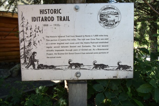 We took a short detour today. Drove up to Eagle River and then up to the end of a side road. It ended at what was a portion of the old historic Iditarod Trail. The marker is below.