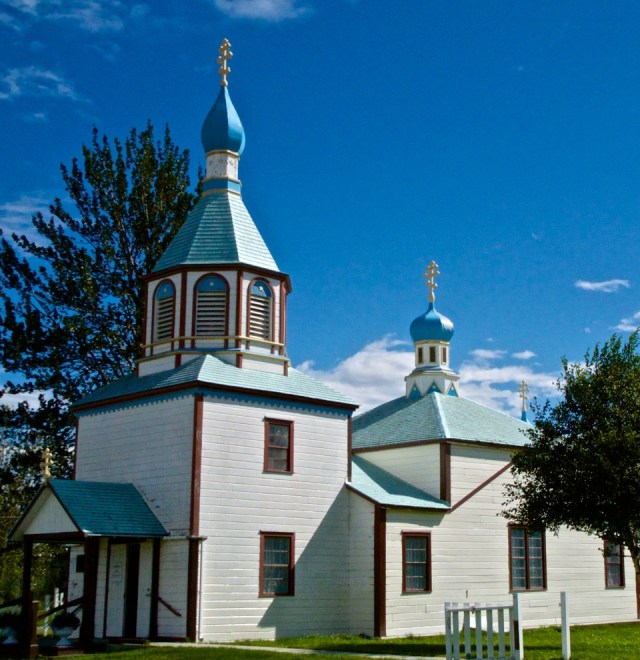 Early this morning it was raining and overcast. We decided to explore a bit, regardless. We drove to the end of the Kenai Spur highway, through Kenai and Nikiski all the way to the Captain Cook Recreation area. Finally on the way back the sun appeared and even though the wind was howling a gale we stopped in Kenai. We found the old Russian Orthodox Church and got a couple of images.