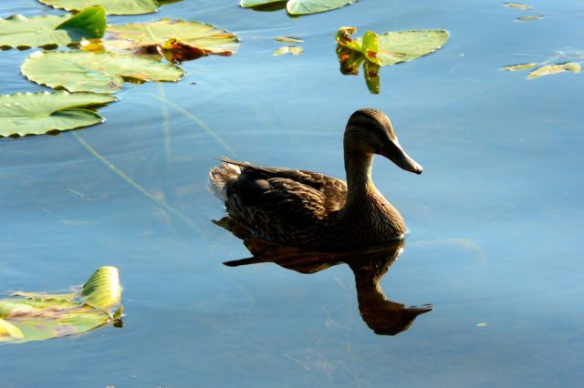 While visiting our friends in Soldotna we went down to their dock on Sports Lake. Saw this female mallard swimming around in the lily pads. Hoped to get a good reflection image but she and the sun did not cooperate fully.