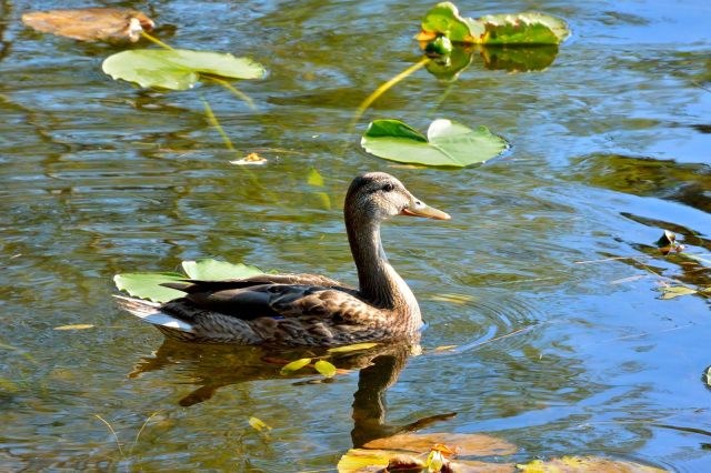 Female Mallard duck swimming in Sports Lake near Soldotna, Alaska.