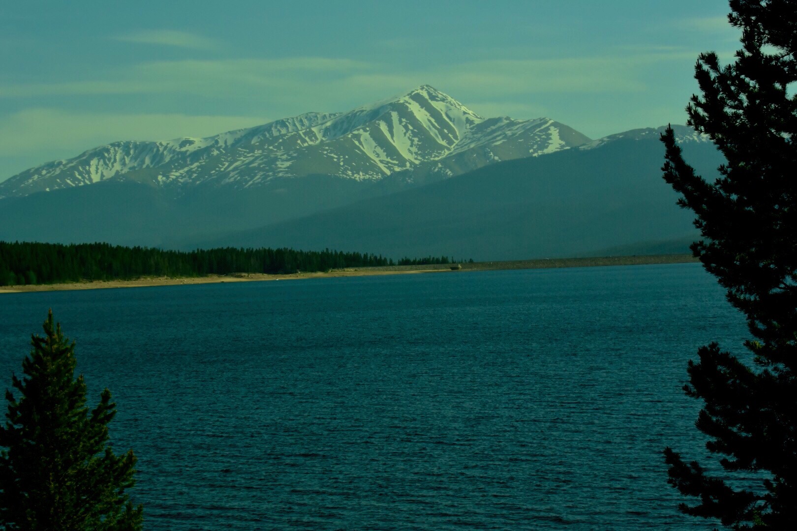 A view of one of the two tallest peaks in Colorado with Turquoise Lake in the foreground.