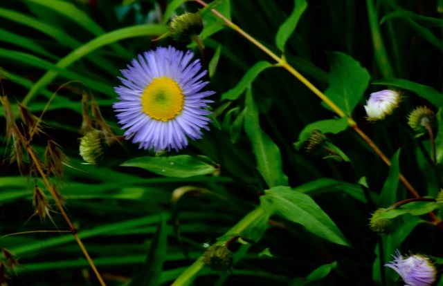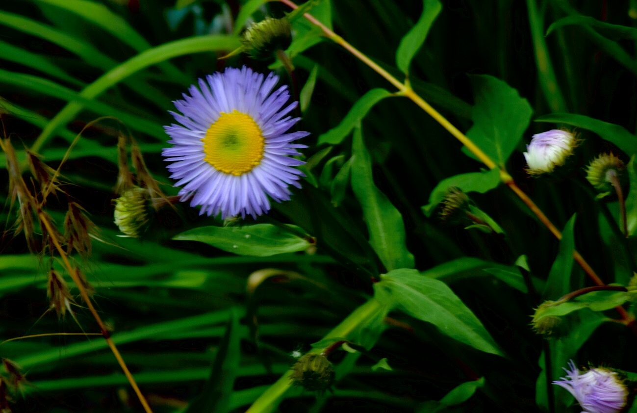 Below, a wild flower, perhaps an aster.