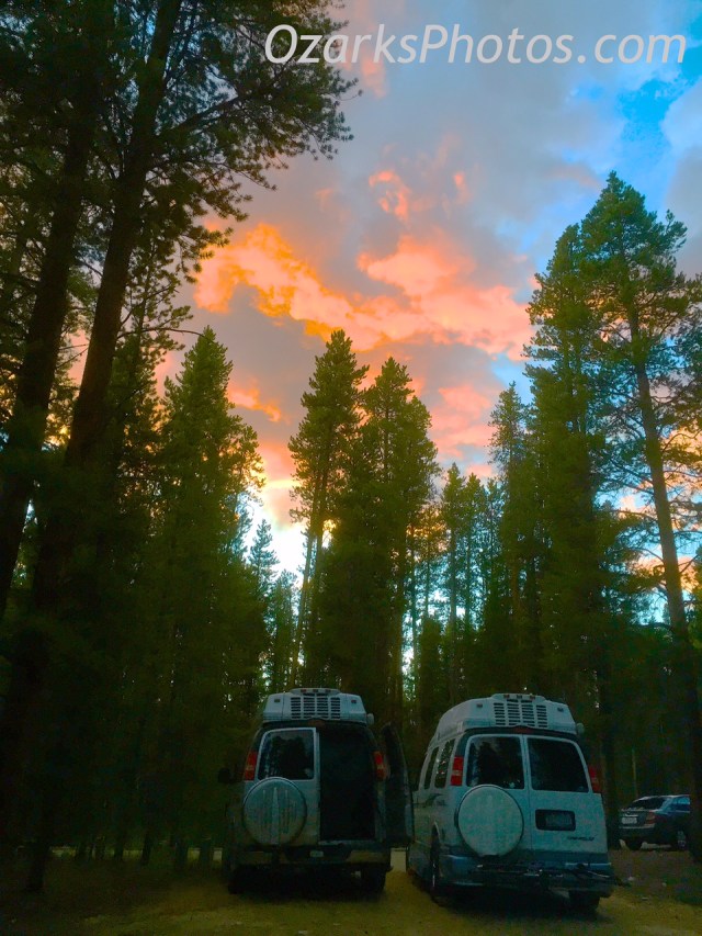 While visiting fellow Roadtrek owners at their campground two nights ago and enjoying S’mores over their campfire we glanced up to view this fiery sunset. We were near Leadville, Colorado and the campfire felt really nice.