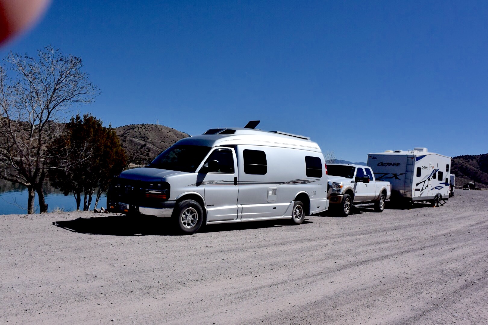 Our Roadtrek and the pickup and trailer of her nephew that guided us here from El Paso. We all spent the night sleeping here at the lake.