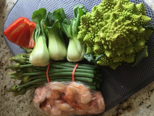 Below are the fruits of Marilyn and Susan’s shopping at the Pike Street market. On the left is an ordinary red pepper, then three baby bok choy, a head of Romanesco (Italian) cauliflower. Below that are garlic scapes and a the bottom is the peeled shrimp. This and a steak will be our late lunch today.