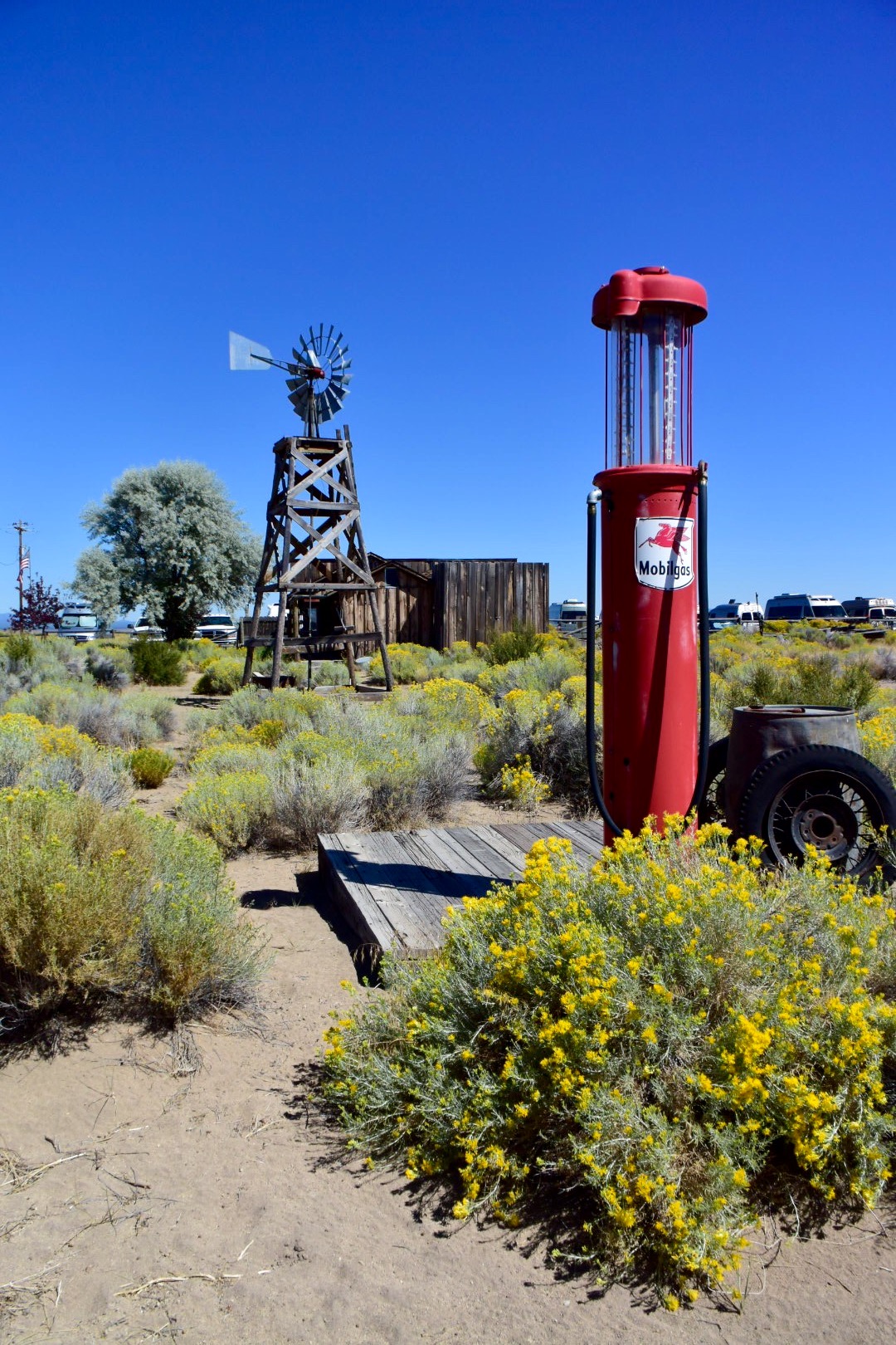 An old Mobil Oil gasoline pump and a working windmill which was pumping water.