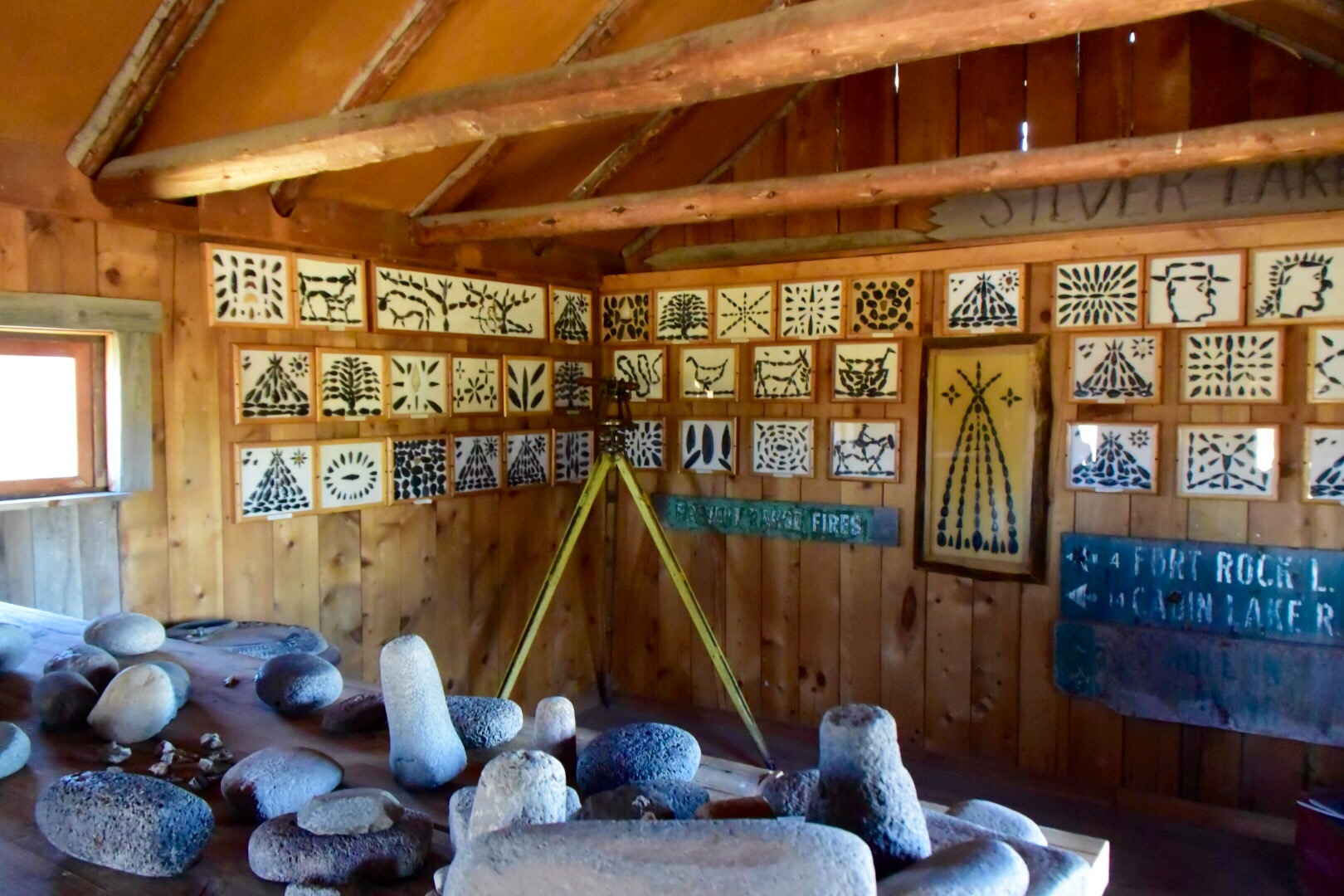 Artifacts in the Widmer Cabin. Oldest Lake County Cultural sites date back 14,500 years. Below are pestles with grindstones for grinding grain, an arrowhead collection from the area Indians, the Lake County obsidian artifacts were traded as far away as New York.