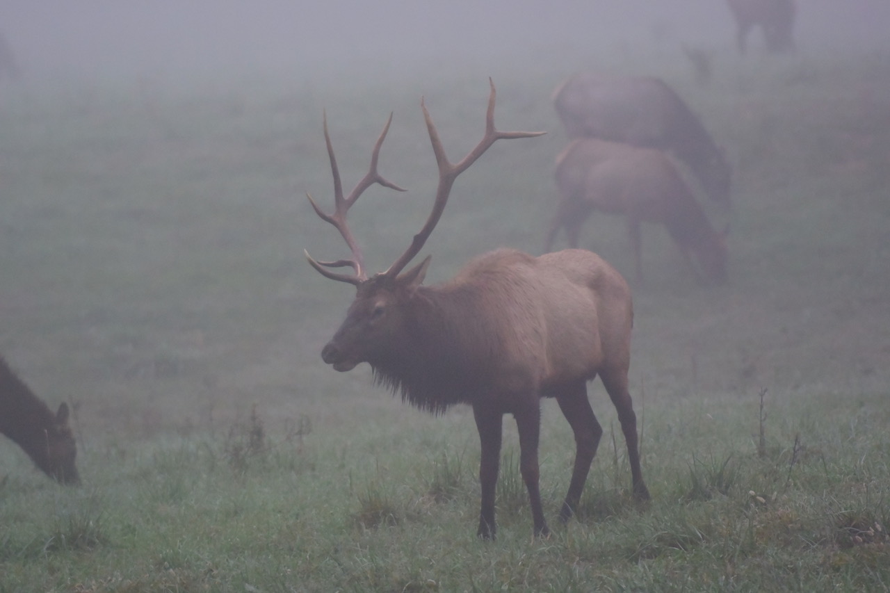 After a very enjoyable time at dinner we drove back to a trailhead to spend the night. Very early the next morning we awakened to a lot of fog, which we had hoped for. We wanted to get some images and video of the elk if we could find them in the valley. As we neared Ponca and were about to give up in our search we found them, and there was even an area where we could park off the highway. Below is one image which will give you some idea of how foggy it was and the enormous size of the very large bull elk with a small portion of his herd of cows. This elk had about 45 to 50 cows in his harem. His antlers show that he has been busy protecting his herd as two of the tines on one side are broken off.