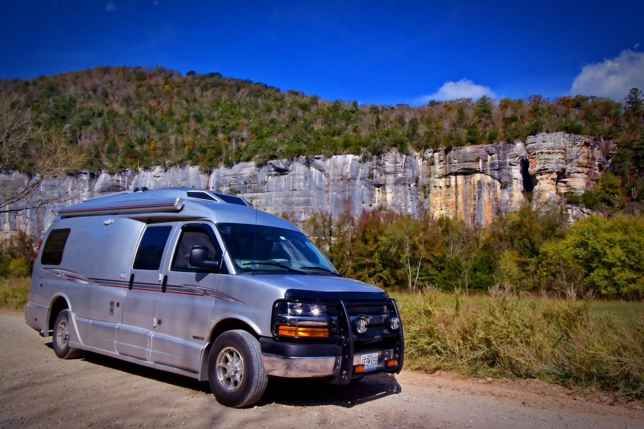 On the way to dinner we decided to drive down to the Steele creek trailhead and see the big bluff there. There were several horse trailers camping there and out on trail rides. We took the opportunity to get an image of our Roadtrek while there with the bluff in the background. The bright blue sky almost makes our silver Roadtrek look blue. 🙂