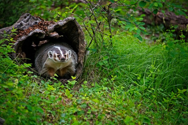 The same badger emerging from a hollow log, possibly checking for a meal?