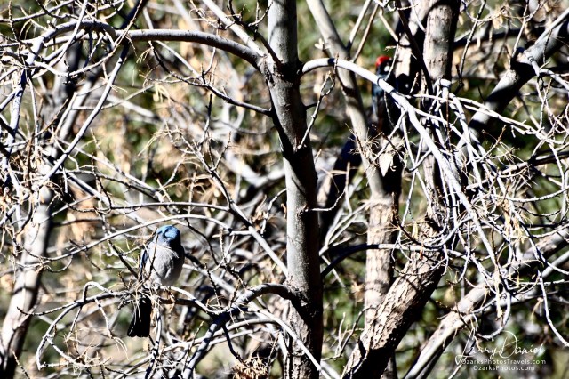 We also saw a few mexican jays . One is below sharing a tree with an acorn woodpecker. The other image is a closeup.
