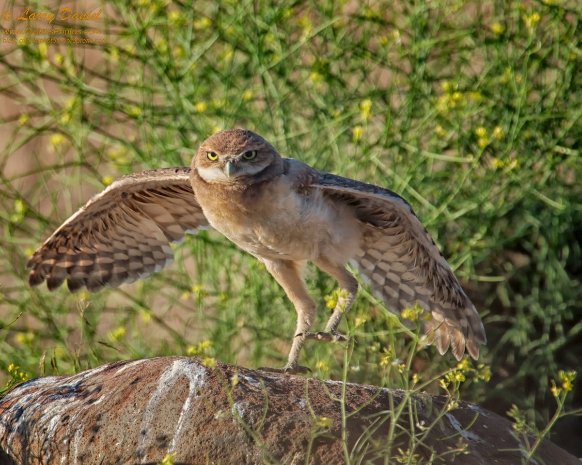 A burrowing owlet in easter Washington, testing its wings. Just a few minutes later this owlet took what appeared to be its first flight. All ended well with no mishaps.